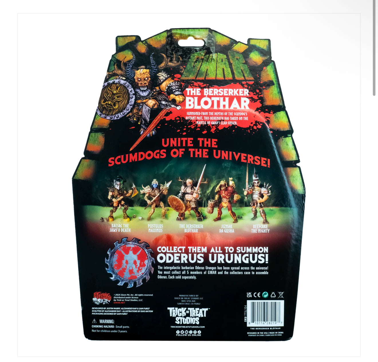 Trick or Treat Studios is proud to present the officially licensed GWAR - Blöthar the Berserker 5" Action Figure. Standing roughly 5 inches tall, this highly detailed figure is a must for any GWAR fan. Packaged in retro style action figure packaging just like your favorite figures from the toy aisle. Backing card features art by Dug Nation.