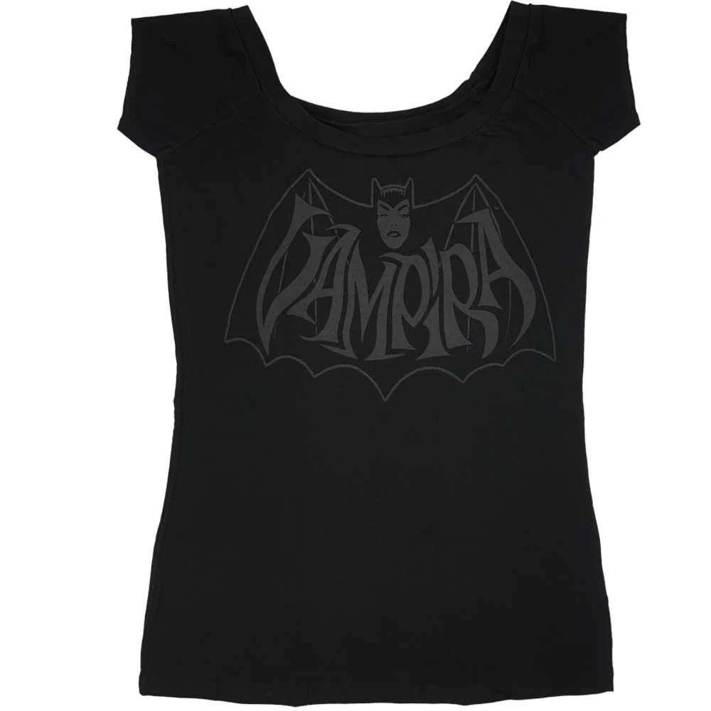 Quickly to the bat-hearse! This officially licensed Vampira shoulder tee features a dark grey Vampira retro bat print. Made from 95% cotton 5% spandex. Made by monsters in the USA.